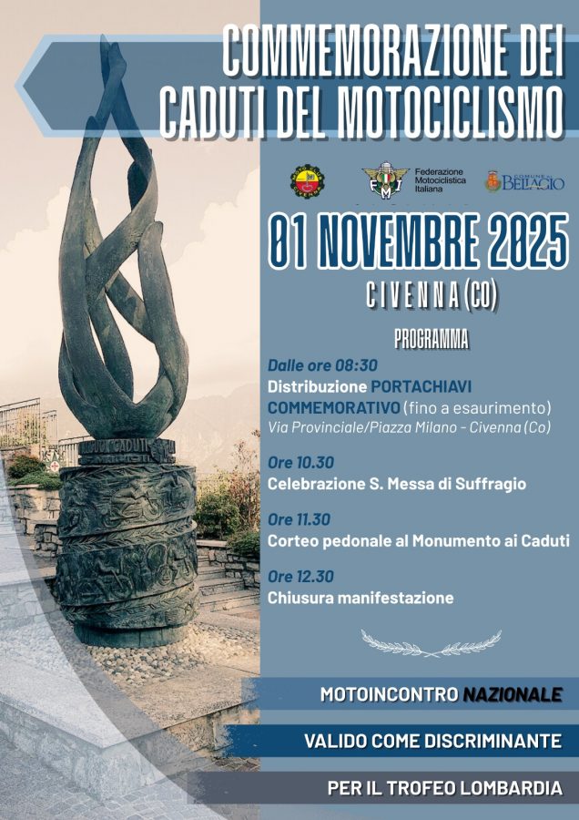 Il Motoclub Civenna (CO) invita tutti i mototuristi piemontesi a partecipare al tradizionale motoincontro nazionale del 1 Novembre per commemorare tutti i centauri caduti presso il Monumento situato proprio nel comune della provincia di Como.
