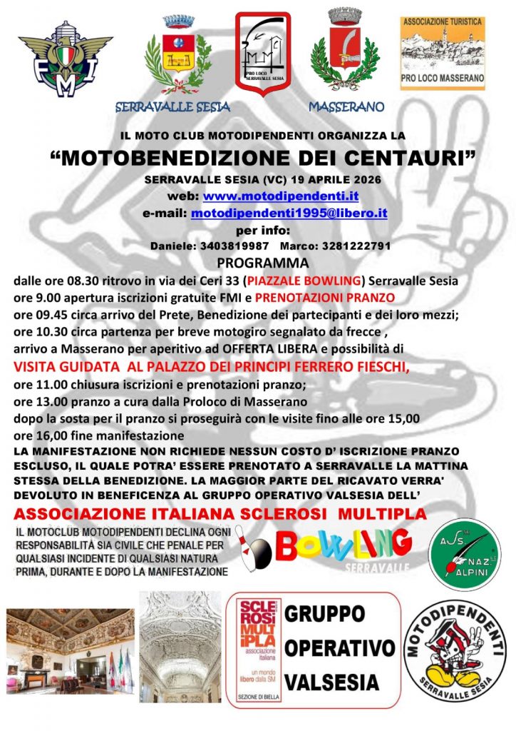 Domenica 19 Aprile 2026 il Motoclub Motodipendenti organizza la tradizionale “Motobenedizione dei Centauri”. Il ritrovo è a Serravalle Sesia (VC), per poi spostarsi come descritto nel programma della manifestazione.