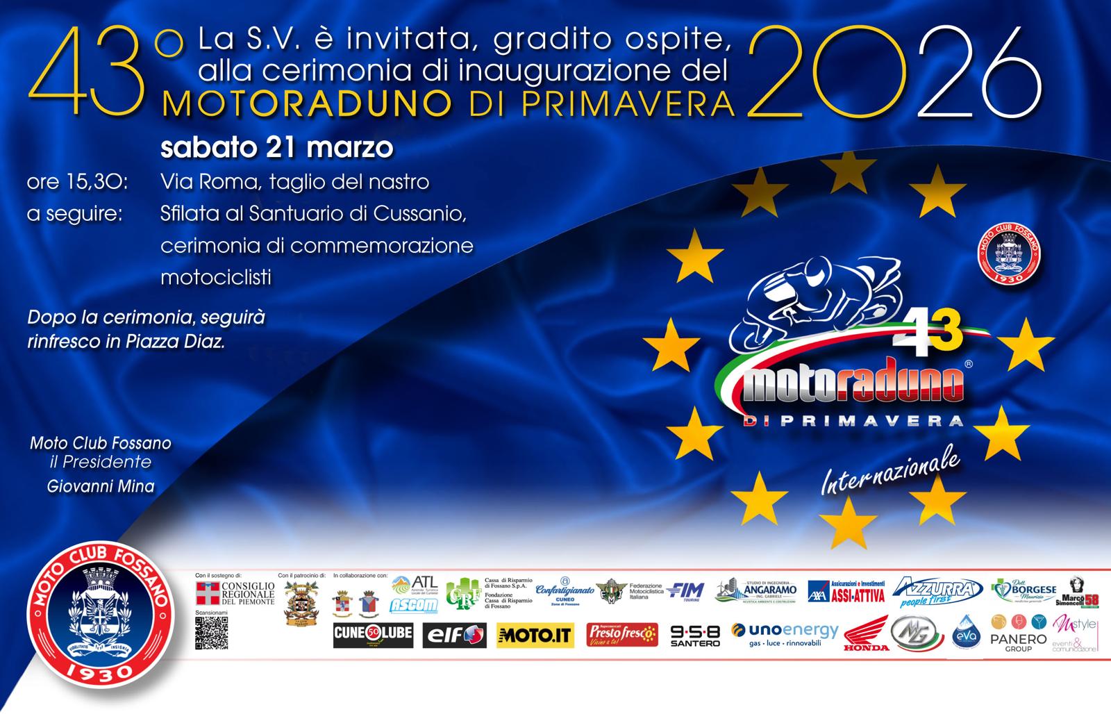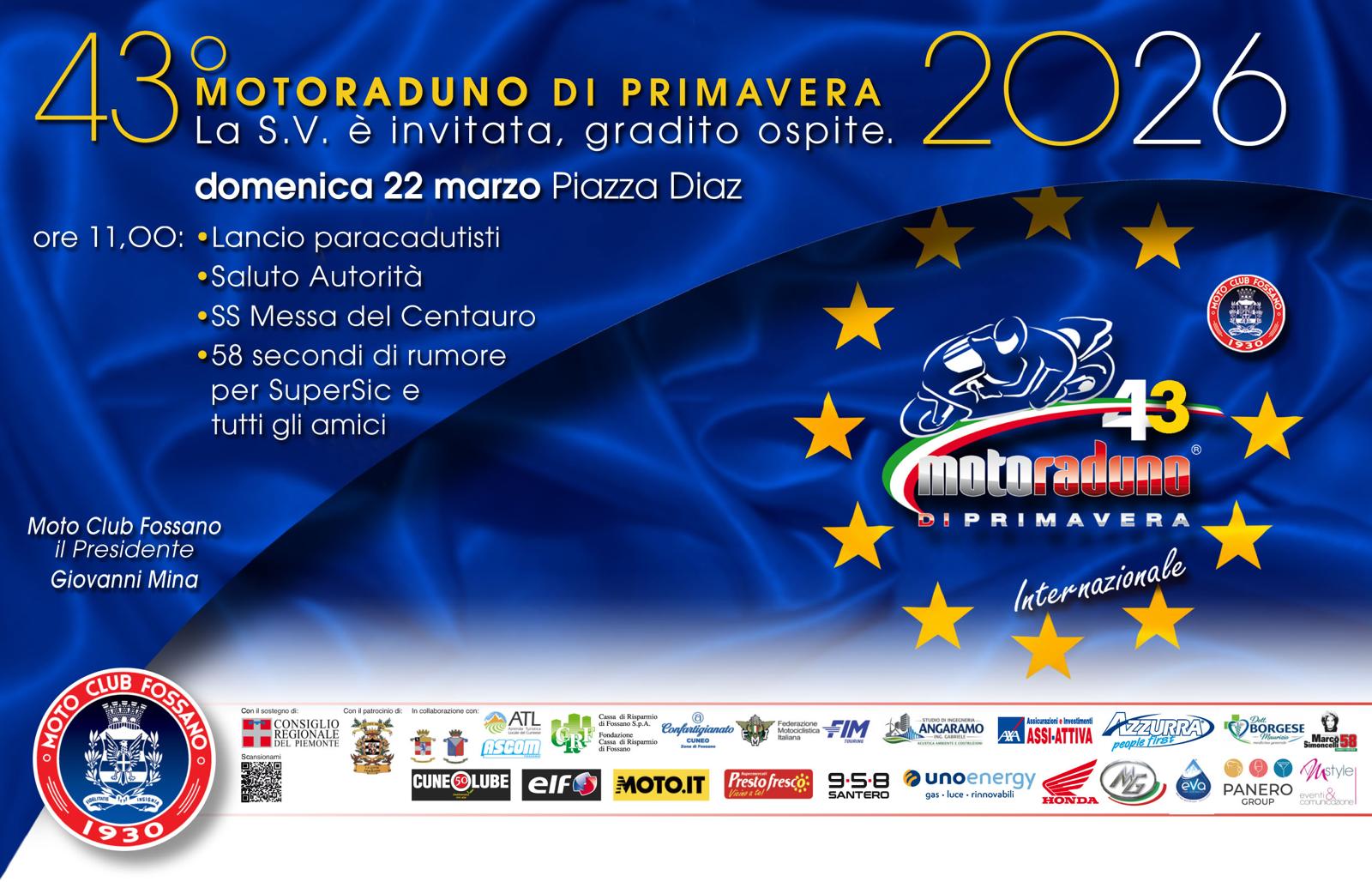Sabato 21 e Domenica 22 Marzo 2026 torna il celeberrimo “Motoraduno di Primavera” di Fossano, evento che quest’anno può fregiarsi del titolo “internazionale”. Tanti eventi, espositori e divertimento per una manifestazione che ogni anno attira numerosissimi centauri da tutta Italia, e non solo.