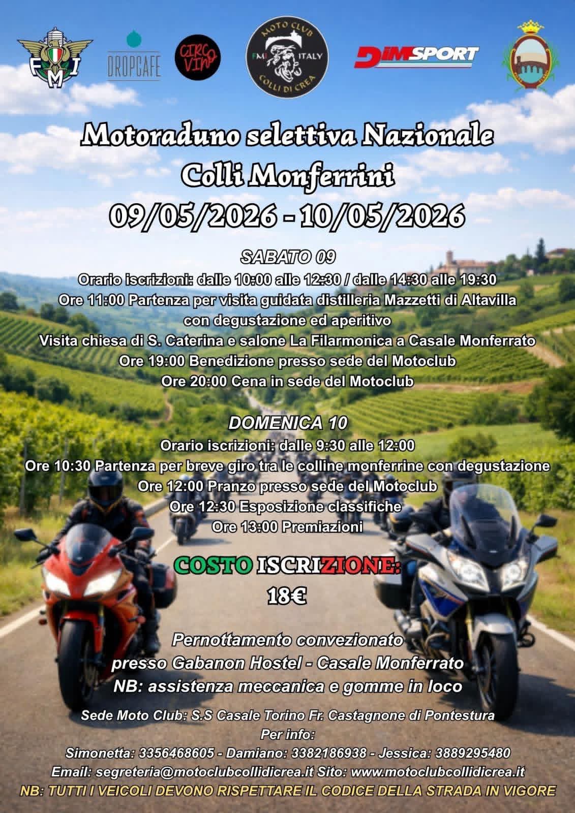 Sabato 9 e domenica 10 maggio 2026 il Campionato Italiano Turismo fa tappa in Piemonte grazie al Motoraduno Selettiva Nazionale Colli Monferrini. Il Motoclub Colli di Crea ha organizzato un week end da non perdere nel Monferrato, tra visite guidate, degustazioni e giri in moto su e giù per le colline.