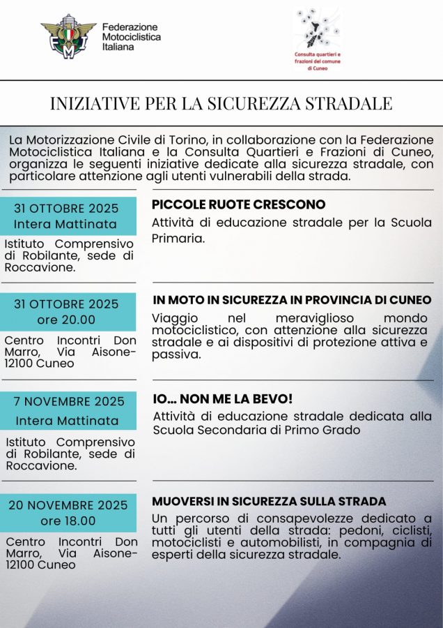 Prosegue nel Cuneese il grosso lavoro dei formatori di educazione stradale che saranno presenti sul territorio con un programma molto articolato .