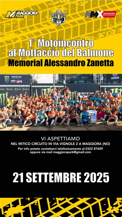 Uno dei circuiti più importanti del motocross piemontese ospita per la prima volta un motoincontro turistico! Domenica 21 settembre 2025 l’appuntamento è al “Mottaccio del Balmone” in via Vignole 2 a Maggiora (NO) per il “Memorial Alessandro Zanetta”, una giornata all’insegna di divertimento, motori, ricordi, cross e turismo.