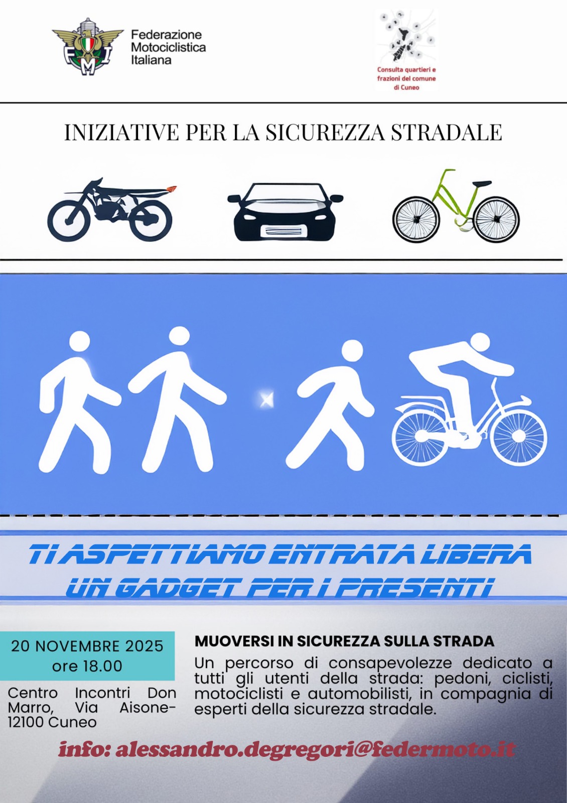 L’ultimo dei quattro appuntamenti promossi dalla Motorizzazione Civile di Torino, in collaborazione con la Federazione Motociclistica Italiana e la Consulta Frazioni e Quartieri di Cuneo, avrà luogo giovedì 20 novembre, alle ore 18, presso il Centro Incontri Don Marro, situato in Cuneo – Via Aisone, Fraz. San Rocco Castagnaretta.